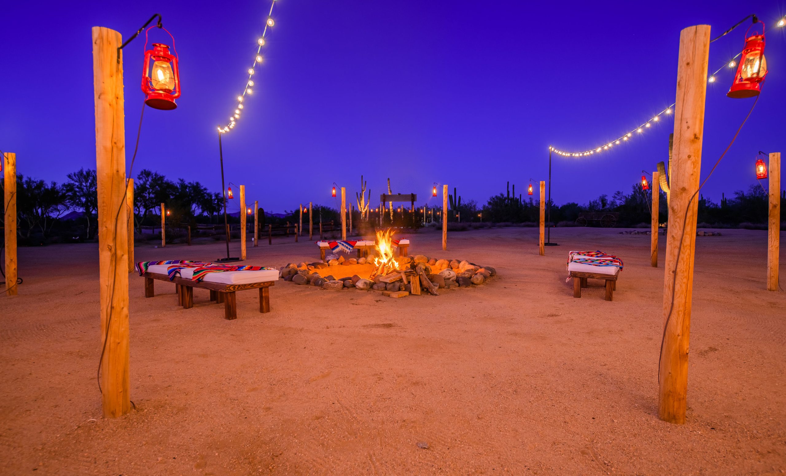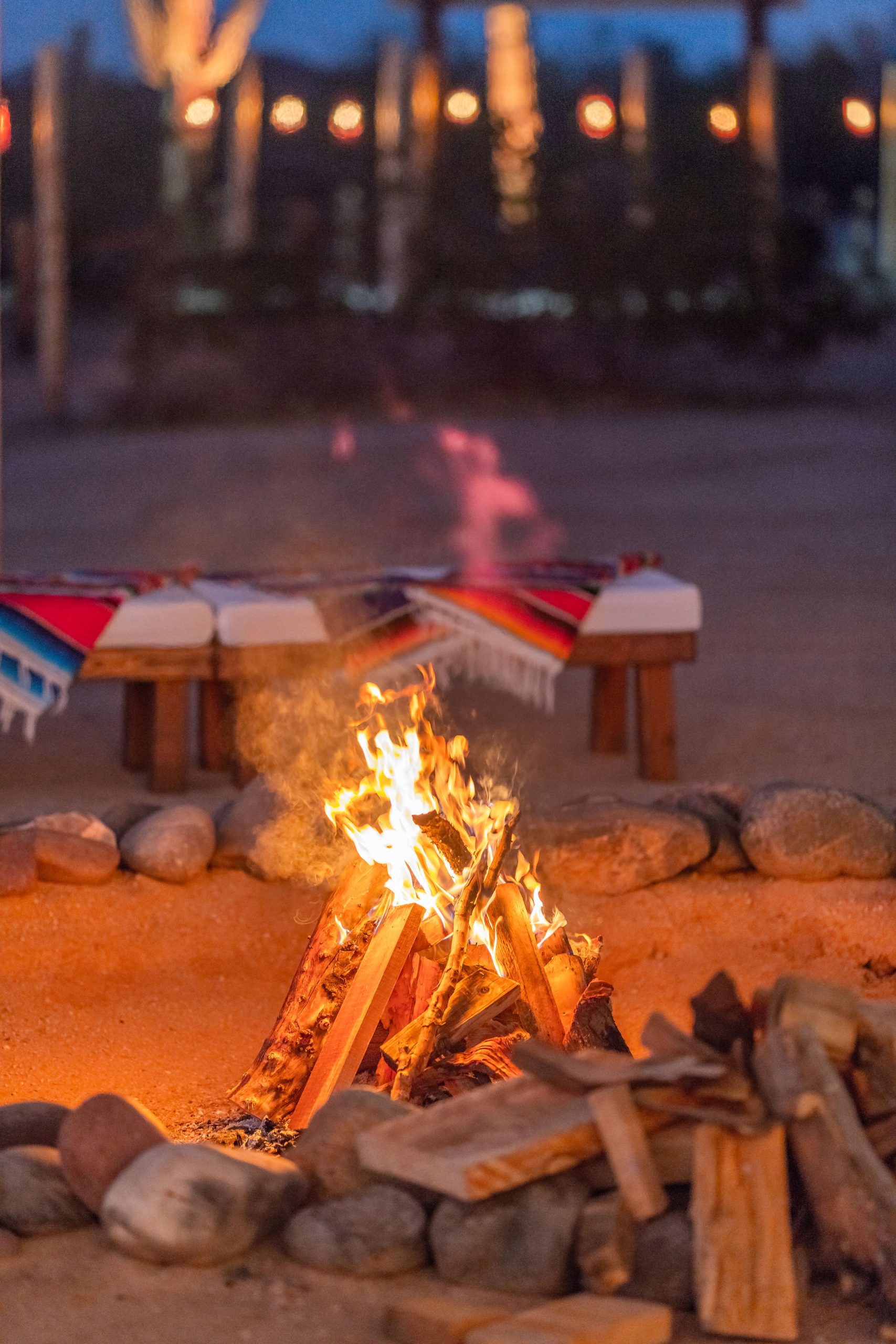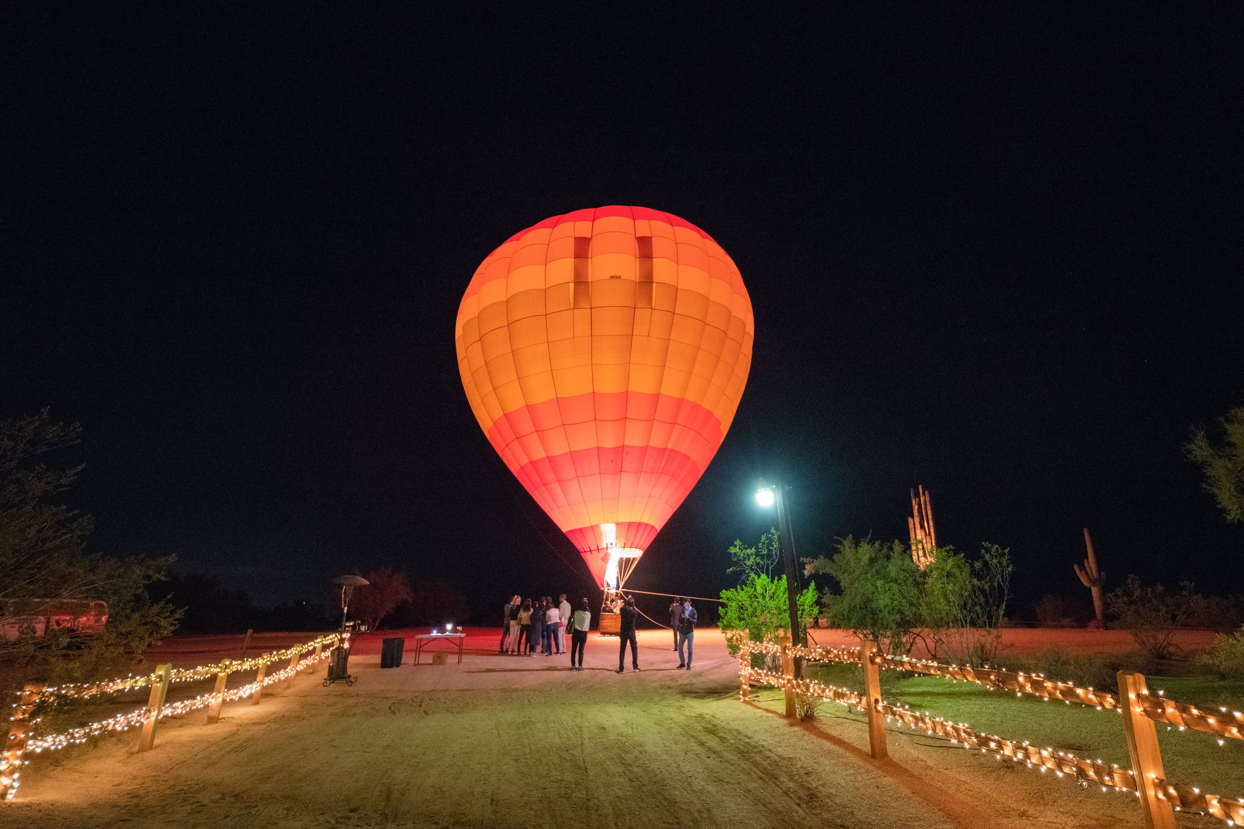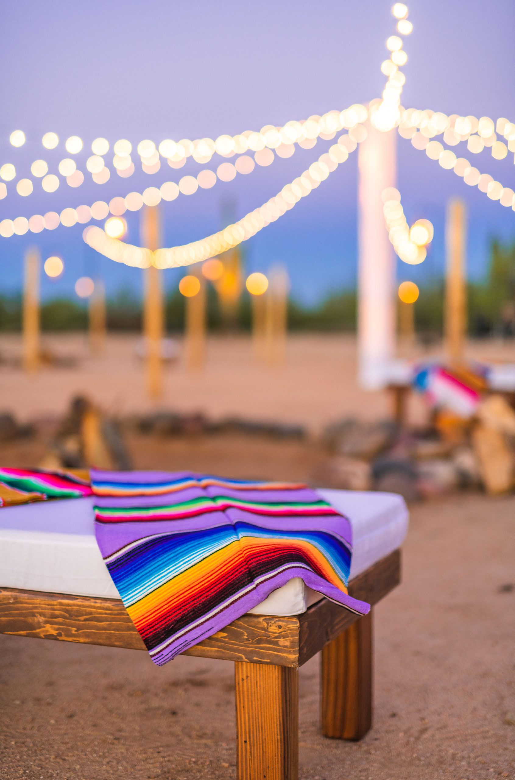 Tucked deep in the desert with nothing but a hand-drawn map and cactus-lined dirt roads to guide us, this destination event was one of our most remote—and one of the most breathtaking! Guests arrived to a warm wooden welcome sign, fire-lit gathering spaces, and the glow of a hot air balloon against a clear desert sky.