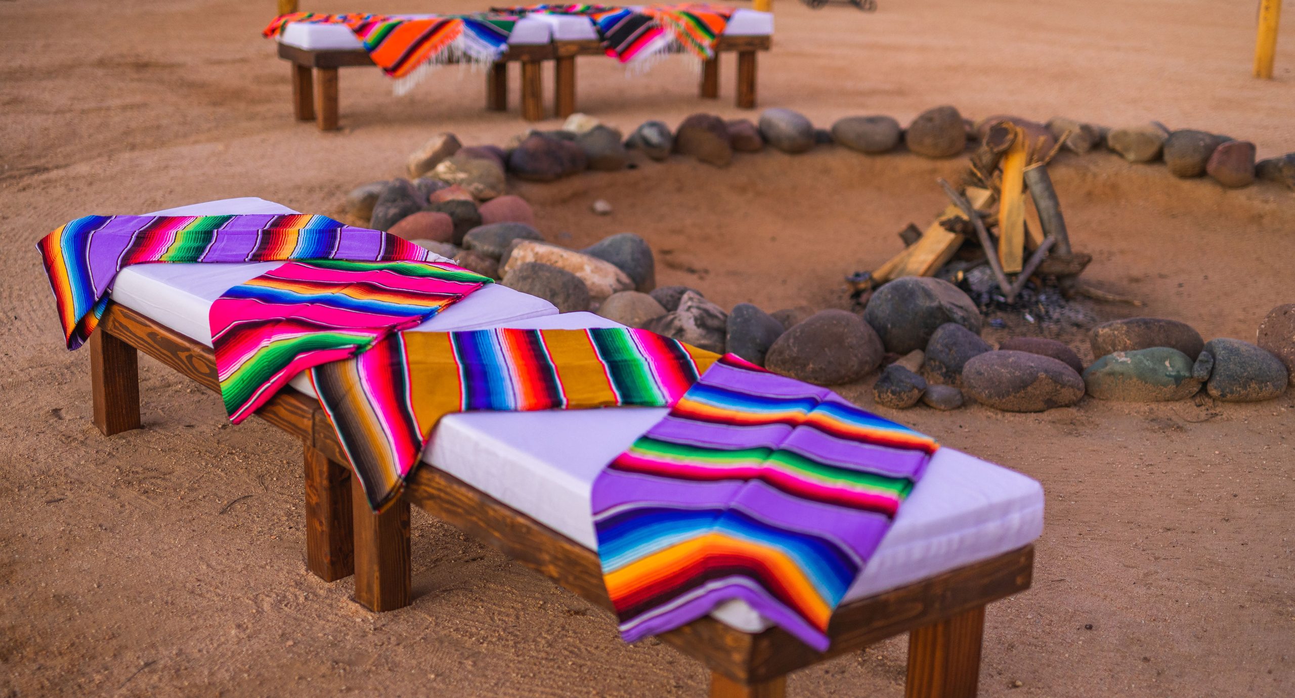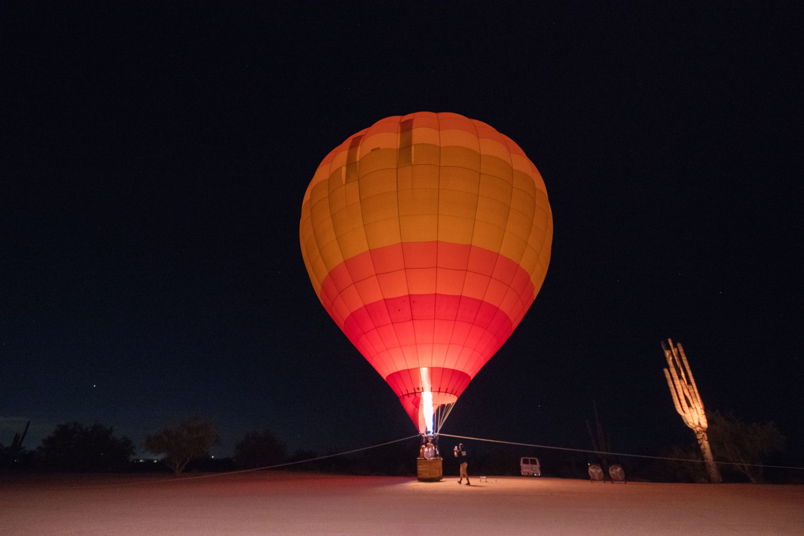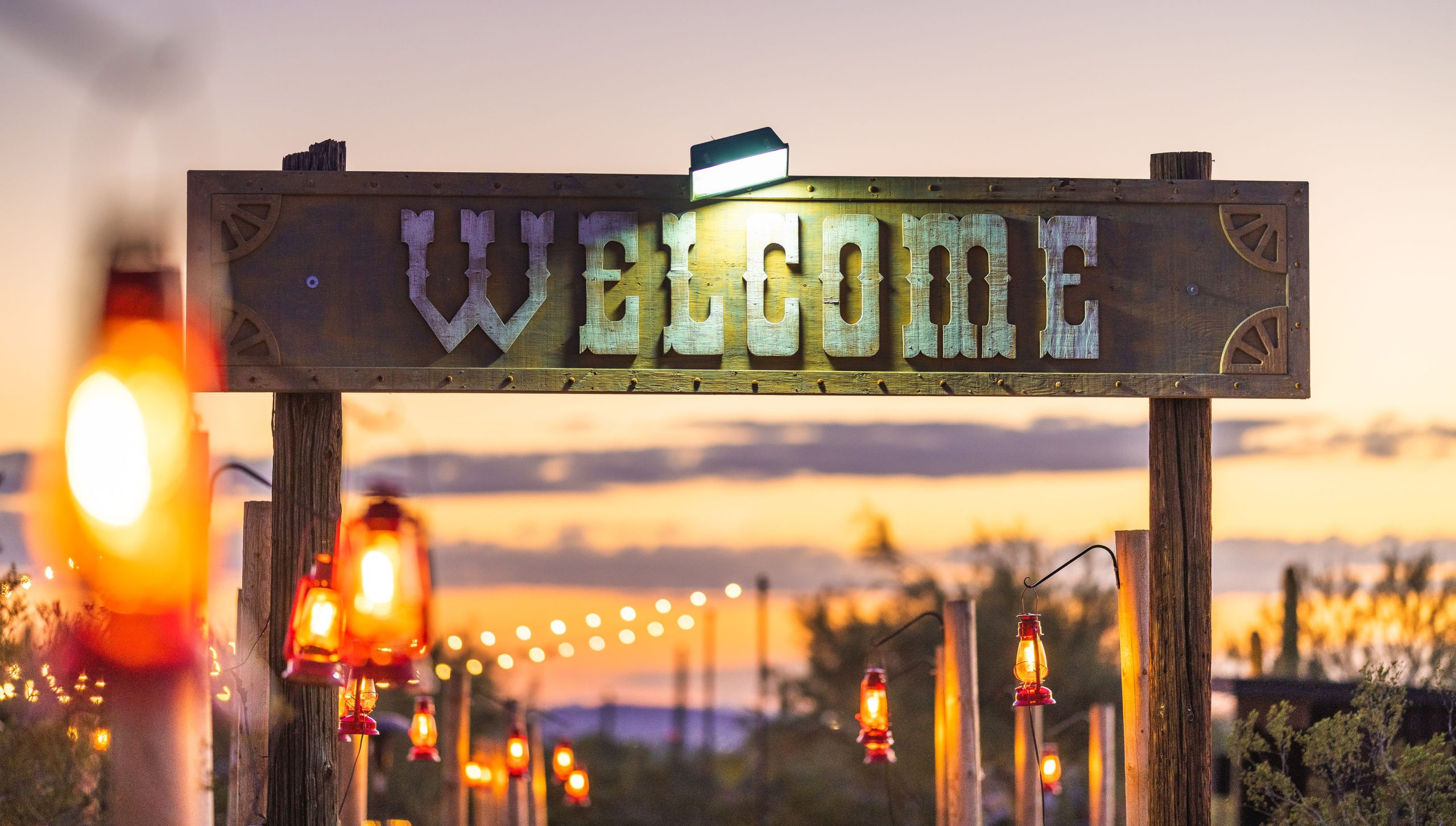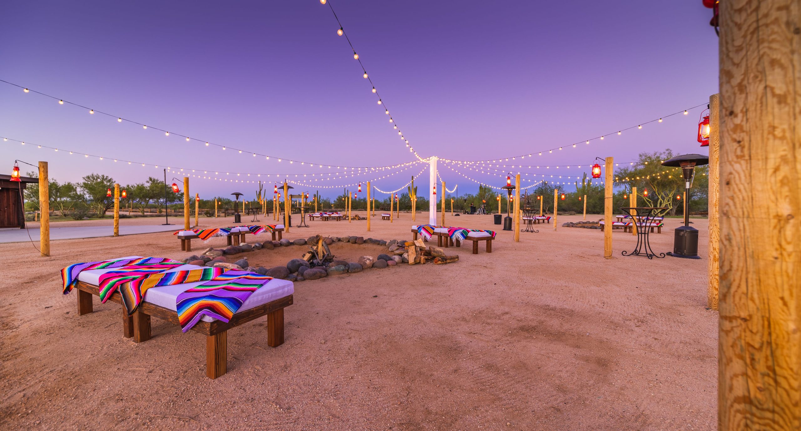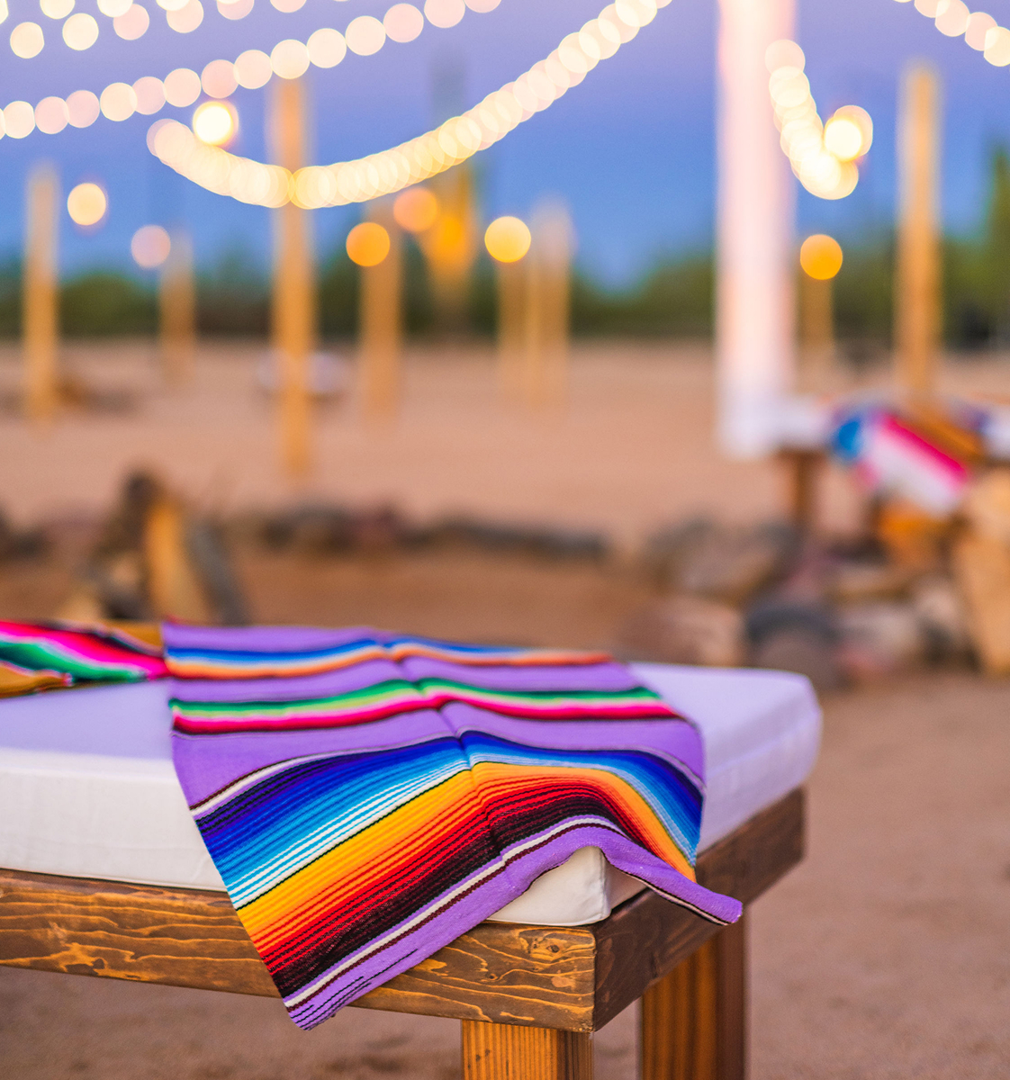 Tucked deep in the desert with nothing but a hand-drawn map and cactus-lined dirt roads to guide us, this destination event was one of our most remote—and one of the most breathtaking! Guests arrived to a warm wooden welcome sign, fire-lit gathering spaces, and the glow of a hot air balloon against a clear desert sky.